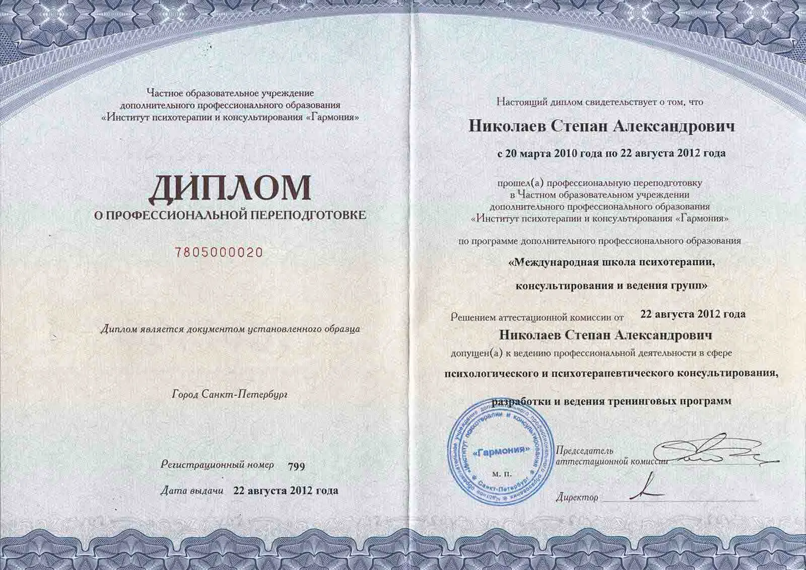 • 2012 — Институт психотерапии и консультирования «Гармония» (психотерапия, консультирование и ведение групп)